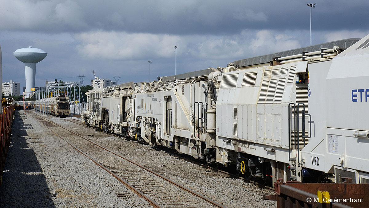 Pour concevoir son nouveau train, construit par Matisa en Suisse, ETF a bien sûr examiné les techniques existantes, mais pour atteindre la performance demandée il fallait d’une part mécaniser un maximum de tâches et d’autre part innover. C’est ainsi que le remplacement des rails passe après celui du ballast et des traverses. Cela facilite la reddition de la voie à 80 km/h sur des rails en barres normales. Avec des LRS (longs rails soudés), il faut procéder à la libération des contraintes. Par ailleurs, pour respecter les 600 m, l’astuce consiste à utiliser deux fois les wagons qui arrivent pleins en ballast neuf, traverses ou rails et qui repartent avec les anciens matériaux. En suite classique, on a des trains spécialisés avec des wagons pleins de ballast neuf qui repartent à vide et des tombereaux vides qui repartent avec le vieux ballast. ETF a imaginé des wagons spéciaux à double flux. Même chose pour les rails.