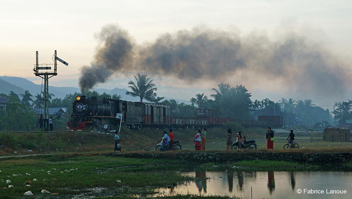 La Birmanie ou Myanmar, le nom birman officiel décidé par la junte militaire qui a pris le pouvoir en 1989, a été l’un des derniers au monde à utiliser la traction vapeur. Au début des années 2000, le réseau national à voie métrique de ce pays, les Myanmar Railways (MR), comptait un effectif d’une quarantaine de machines issues de trois séries de locomotives : YB et YC Pacific d’origine anglaise datant des années 30-40 et YD Mikado de même origine. Toutes les machines en service avaient été modifiées pour fonctionner au fioul. On les trouvait principalement en tête du train mixte de Bago à Mottama, ville située à 200 km vers le sud-est du pays et la frontière thaïlandaise. Le voyage de Bago à Mottama à bord du train mixte durait une dizaine d’heures, si tout allait bien, ce qui était difficile de prévoir au gré des manœuvres, croisements, dépassement, prises d’eau et autres péripéties, et la vitesse dépassait rarement les 30 km/h. À une centaine de km de Bago, un autre dépôt, Pyuntasa, utilisait quotidiennement la traction vapeur sur la petite antenne de Madauk, embranchée vers l’est sur la double voie de la ligne du nord vers Mandalay. Malgré l’arrivée récente de nouvelles diesels, l’extension du réseau a longtemps assuré la pérennité de la traction vapeur, mais c’est finalement en avril 2008 que les dernières locomotives à vapeur ont cessé leur service. Sept ans plus tard, les panaches font leur retour sur les rails à voie métrique du réseau birman. À la faveur d’un projet de circulations touristiques vers le site archéologique bouddhique de Bagan, trois locomotives à vapeur ont été restaurées par les ateliers d’Insein à Rangoon. Après de longues négociations, le voyagiste allemand FarRail Tour propose de nouveau cette destination depuis 2017. Devant le succès de ces premiers trains spéciaux, un nouveau a été est organisé en janvier 2018.